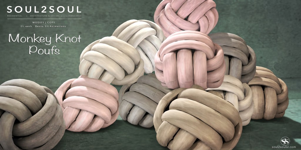 New Release Soul2Soul. Monkey Knot Poufs. Single colours and fatpacks available at the Soul2Soul Mainstore.