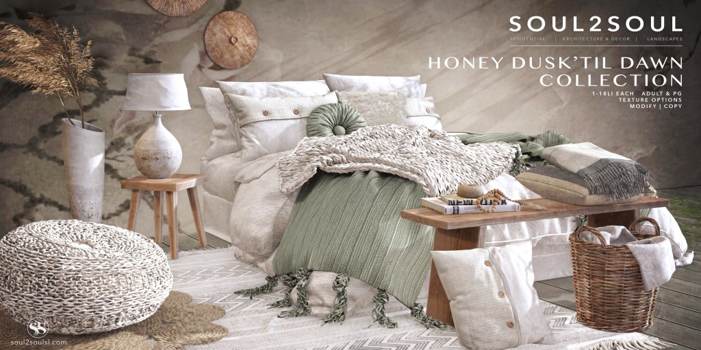 The Bed is available in Adult and PG. The Bed Throws and Accent Cushion have a choice of texture options. The Pouf has sit bento anims and texture options. The Lamp has a menu-driven light system with on/off/intensity options.