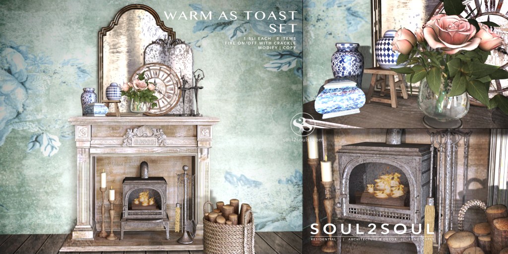 Reclaimed carved wood fireplace, stripped of its paint together with wood burning stove forms the centrepiece of the Warm as Toast Set. Two antique mirrors showing their aged character with their patina are cluttered together with a vintage wall clock. A useful log basket and fire tools combine with wooden candlesticks, a set of three chinaware in willow pattern, ballerina figurines and pink blush roses in a vase completes the pretty decor.