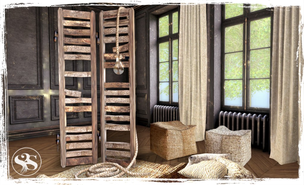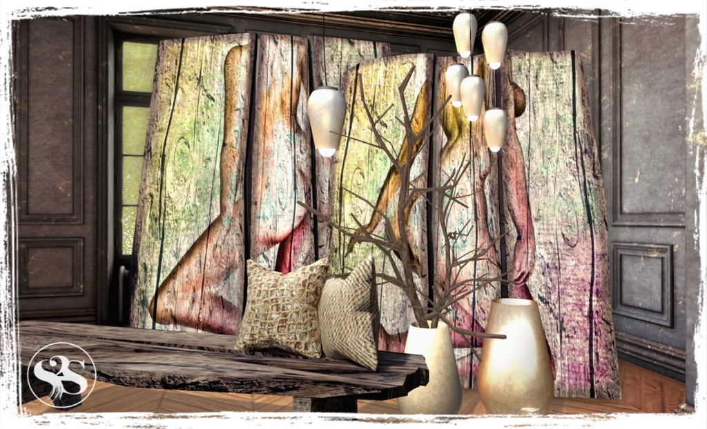 This set includes an old wooden bench with comfy cushions with bento sit anims at 2li. Two original artworks, nude studies painted onto wood to lean up against a wall 1li each. Pots set with twigs 4li, and a lights pack with a pendant 3li and a grouping 5li with on/off/intensity menu and with height adjustable wires. Handcrafted original mesh. Modify | Copy
