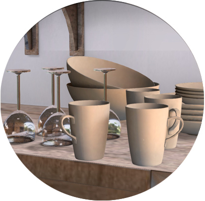 An upcycled divider provides the perfect organiser for herbs both in a jug and old beach bag. An old wooden box organises books and lemonade with freshly picked hydrangea. To complete the decor an antique chair with cushion, table and lamp, combines with two tall floor candlesticks with flickering flames and a quirky teapot planter and cup ‘n’ saucer. 1li-5li each. he chair has singles bento animations. The lamp has a menu-driven light system with on/off/intensity options. Candles have flame on/off on touch.