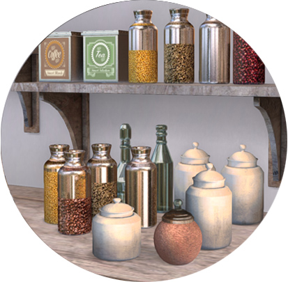 Four Decor sets to compliment the Rustic Chic Kitchen. 4-6 items in each set. 0.5-2li each item, 20 items in all. Available in individual sets or a fatpack for a discount. Handcrafted original mesh. Modify | Copy.