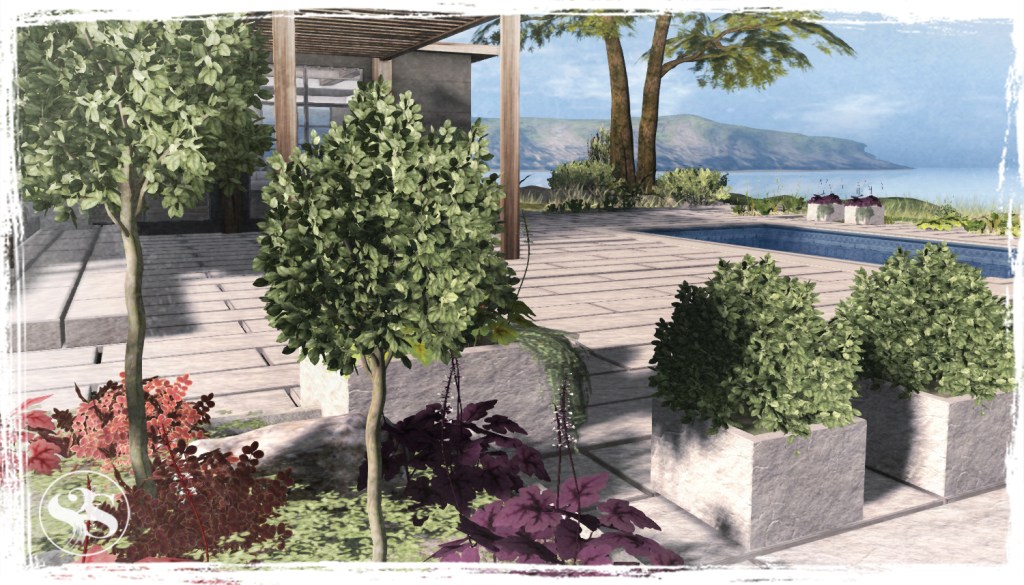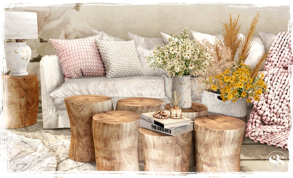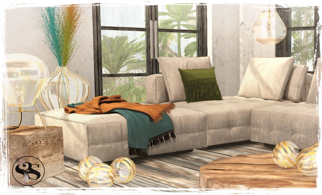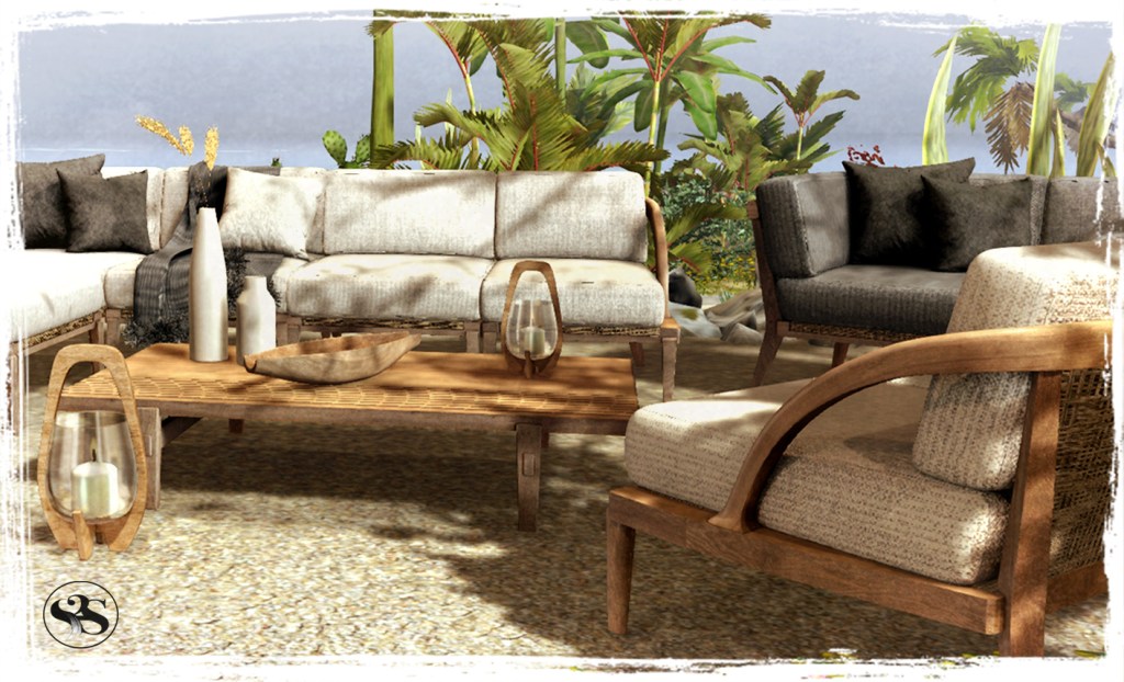 A shady corner for hot days or a snug outdoor space for those cooler nights. The Sienna Snug Set includes a comfy sofa seating area in earthy tones under a dappled shade pergola against an old stacked stone wall and stone pavers patio. Coffee Table, Stool Drinks and Snacks completes the Set. Many cuddles and singles bento animations.