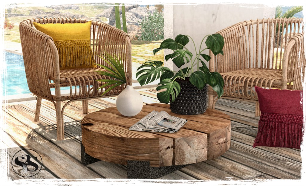 Includes Seville Rattan Chair with and without the Cushion 5li and 6li, with Bento singles animations. Seville Tassle Cushion 1li has many fabric colour options and is included as a separate item! Seville Coffee Table at 2li and Seville Monstera Plant 2li, Seville Leaf Vase 1li and Seville Newspaper 1l. Handcrafted mesh. Modify | Copy.