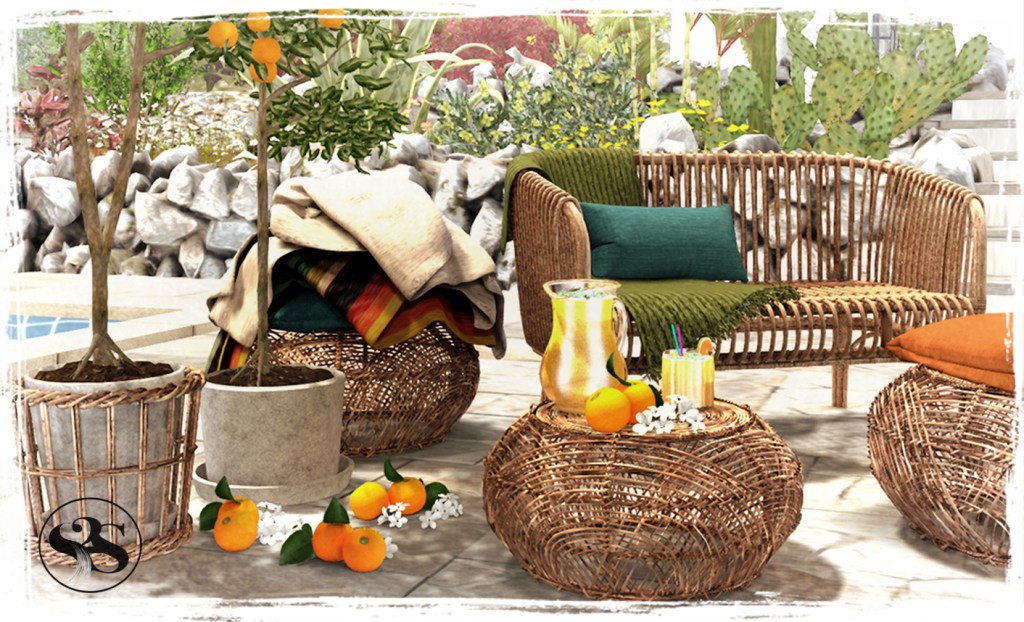 9 Items. Includes Seville Orangery Rattan Sofa with knitted wool throw & cushion with many fabric colour options 7li. With Bento cuddles & singles animations. and a ton of fabric options 3li. Rattan Pouf with cushion with singles anims and a ton of fabric options 3li. Rattan Pouf with blankets has texture options for both blanket & cushion 6li. Rattan Coffee Table 2li. range Juice Jug, Drink and Orange Fruit & Blossom decor 1li each. Orange Tree with Rattan planter 7li. Sapling Tree with Stone Planter 3li.