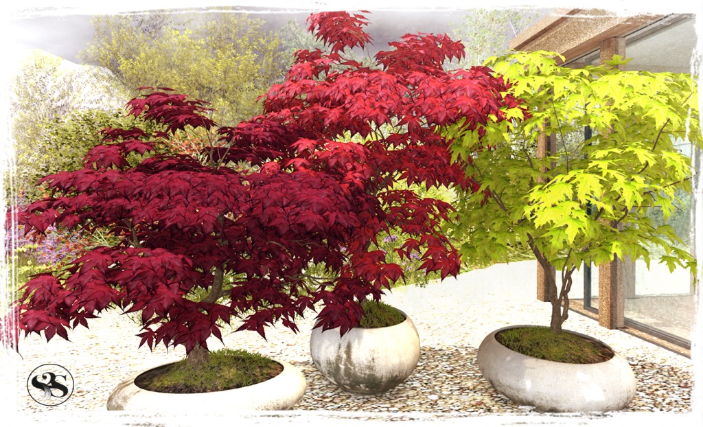 A collection of three Japanese Acer Tree varieties in weather worn Planters with two texture options for the planters. For indoor or outdoor use.