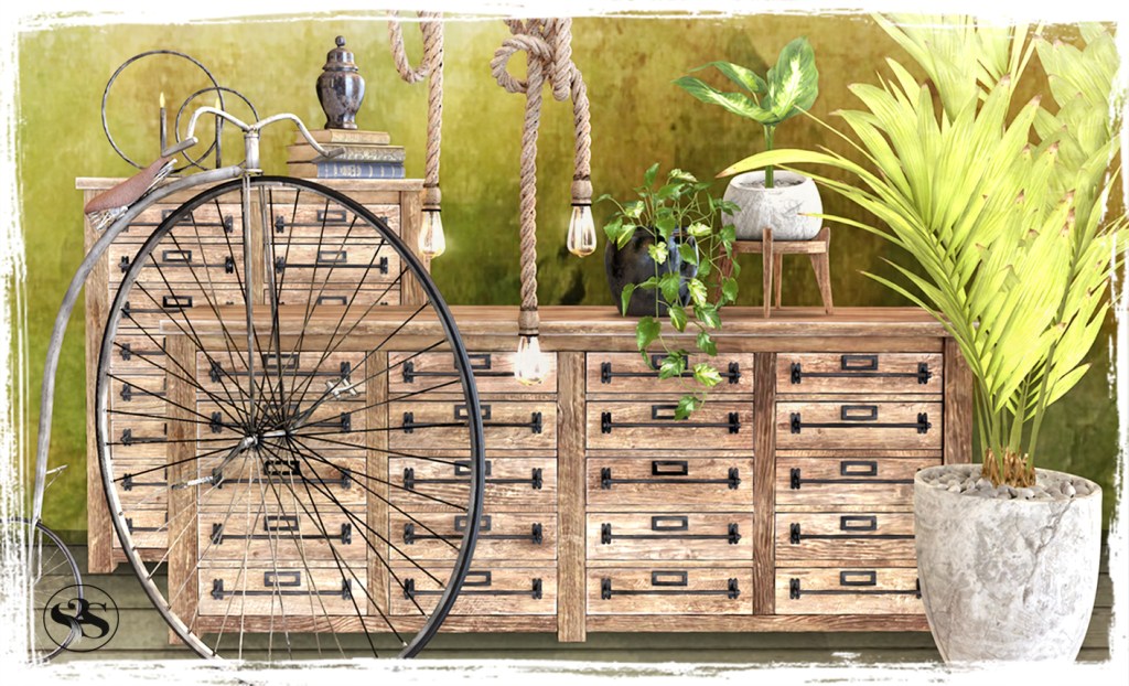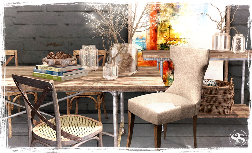 This set includes an old wooden bench with comfy cushions with bento sit anims at 2li. Two original artworks, nude studies painted onto wood to lean up against a wall 1li each. Pots set with twigs 4li, and a lights pack with a pendant 3li and a grouping 5li with on/off/intensity menu and with height adjustable wires. Handcrafted original mesh. Modify | Copy