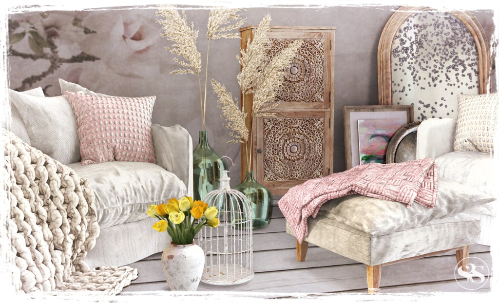 By popular request here’s the cuddle couch! The Honey Comfort Couch Set offers a soft cotton upholstered cuddle couch with throw and accent cushions in a pastel palette together with a fluffy faux fur cushion. Dried flowers and grasses in worn out terracotta pots completes the set.